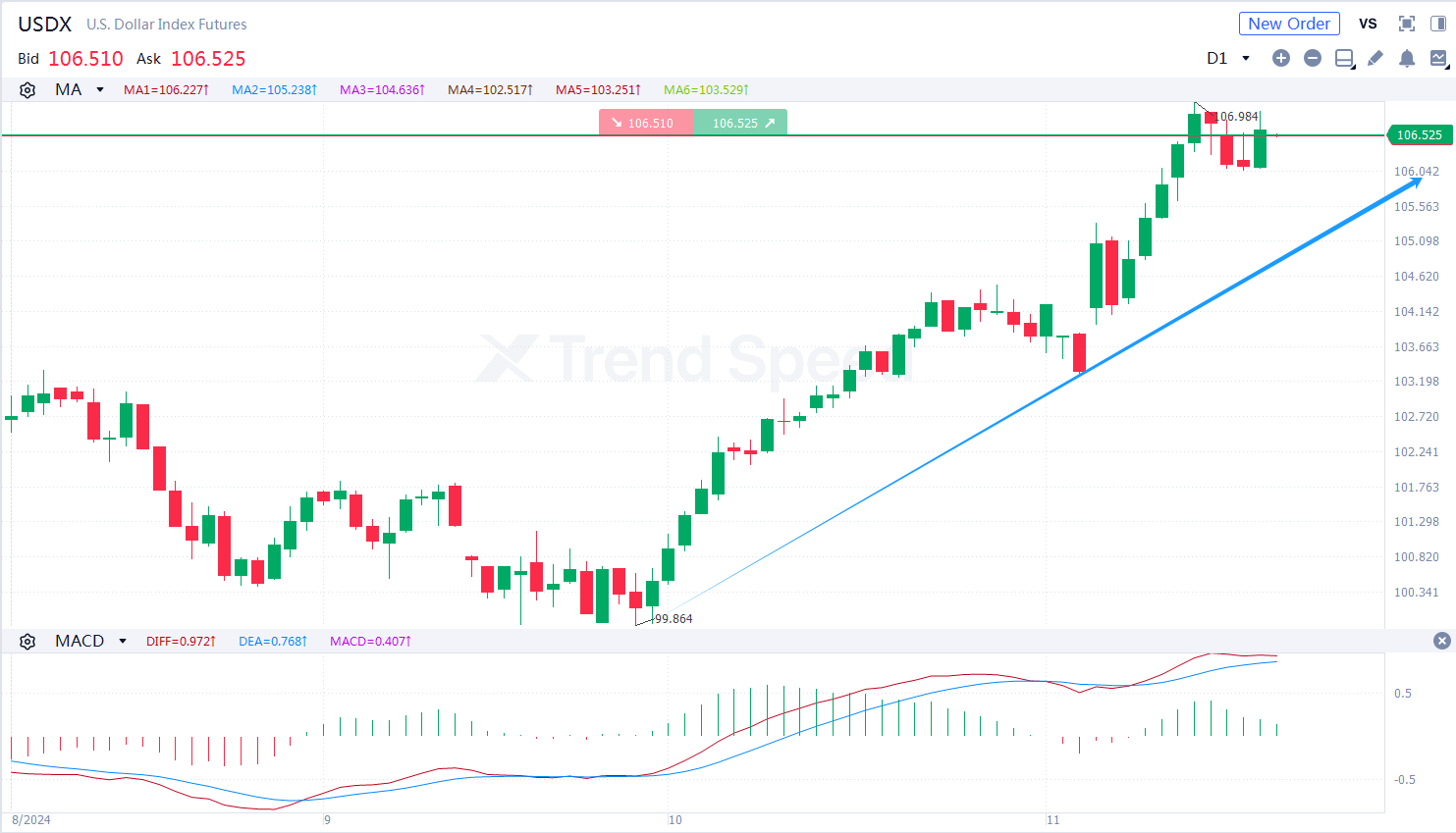 日线图上,USDX高位运行,短线牛市趋势占上风,技术指标上,MACD金叉后上行,显示USDX将进一步上涨。投资者需关注USDX能否突破107.0阻力,若突破107.0阻力,上方阻力位于107.8附近。