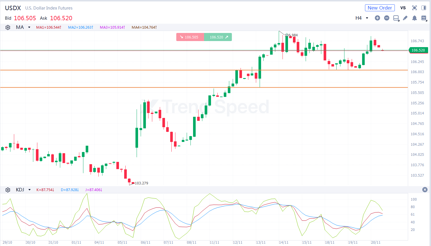 4小时图上,USDX震荡上行,市场多头趋势为主,技术指标上,KDJ金叉后上行,显示市场趋势看涨,投资者需关注USDX能否突破106.0支撑。若回落则有望进一步上涨但稳定在106.0。
